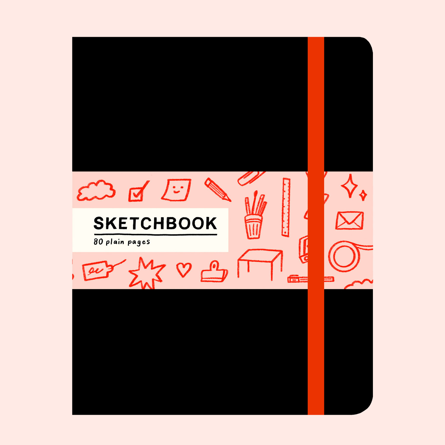 Each sketchbook contains 80 pages of beautifully smooth, plain, off-white paper (100gsm) which is acid-free and sustainably-sourced. Stitch-binding allows the pages to open flat making it a pleasure to work in. All wrapped in a softback vegan PU leather cover which offers protection as well as flexibility. It’s complete with rounded corners, a ribbon bookmark, a handy expandable back pocket and a bright red band of elastic to keep it all tidy when closed.