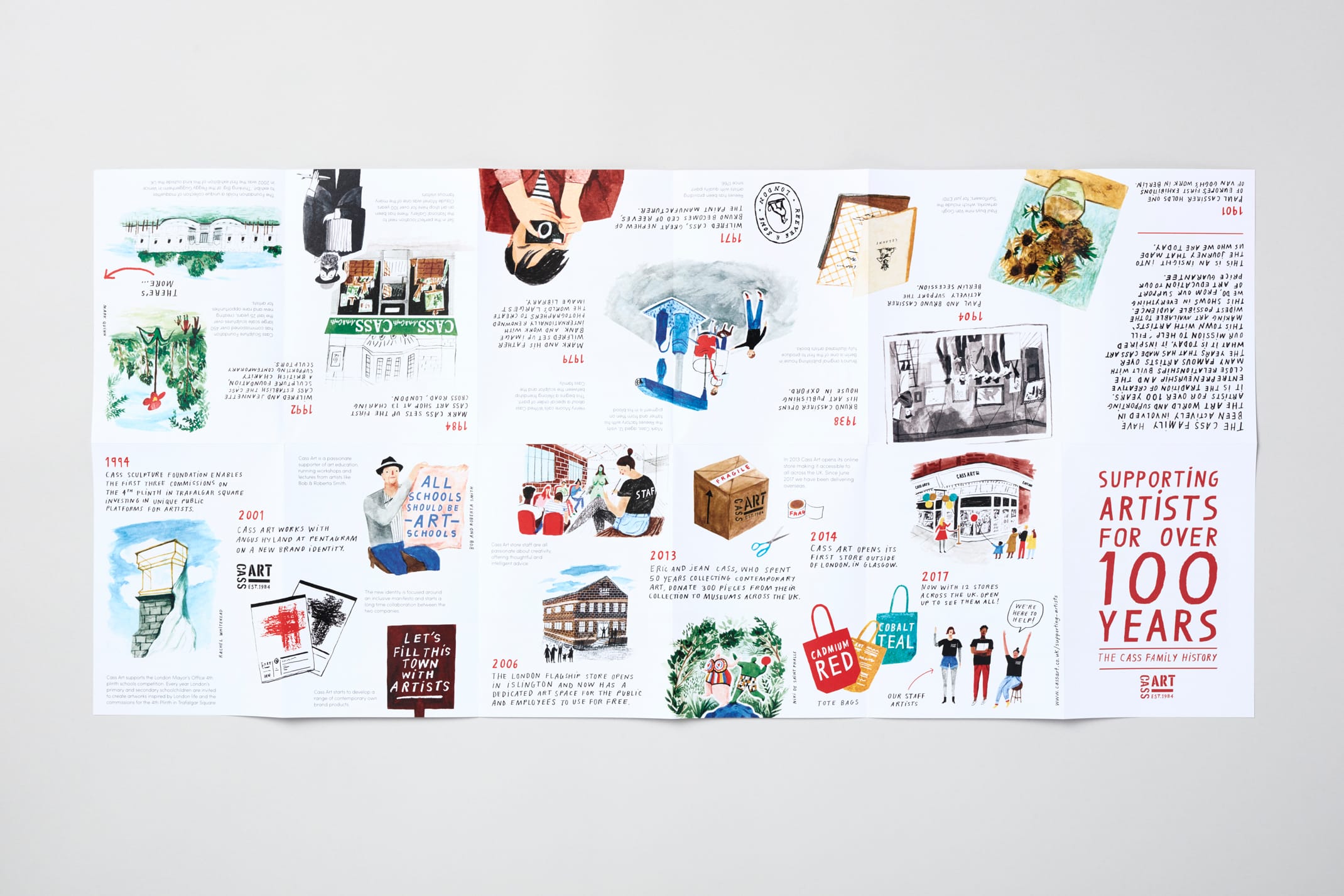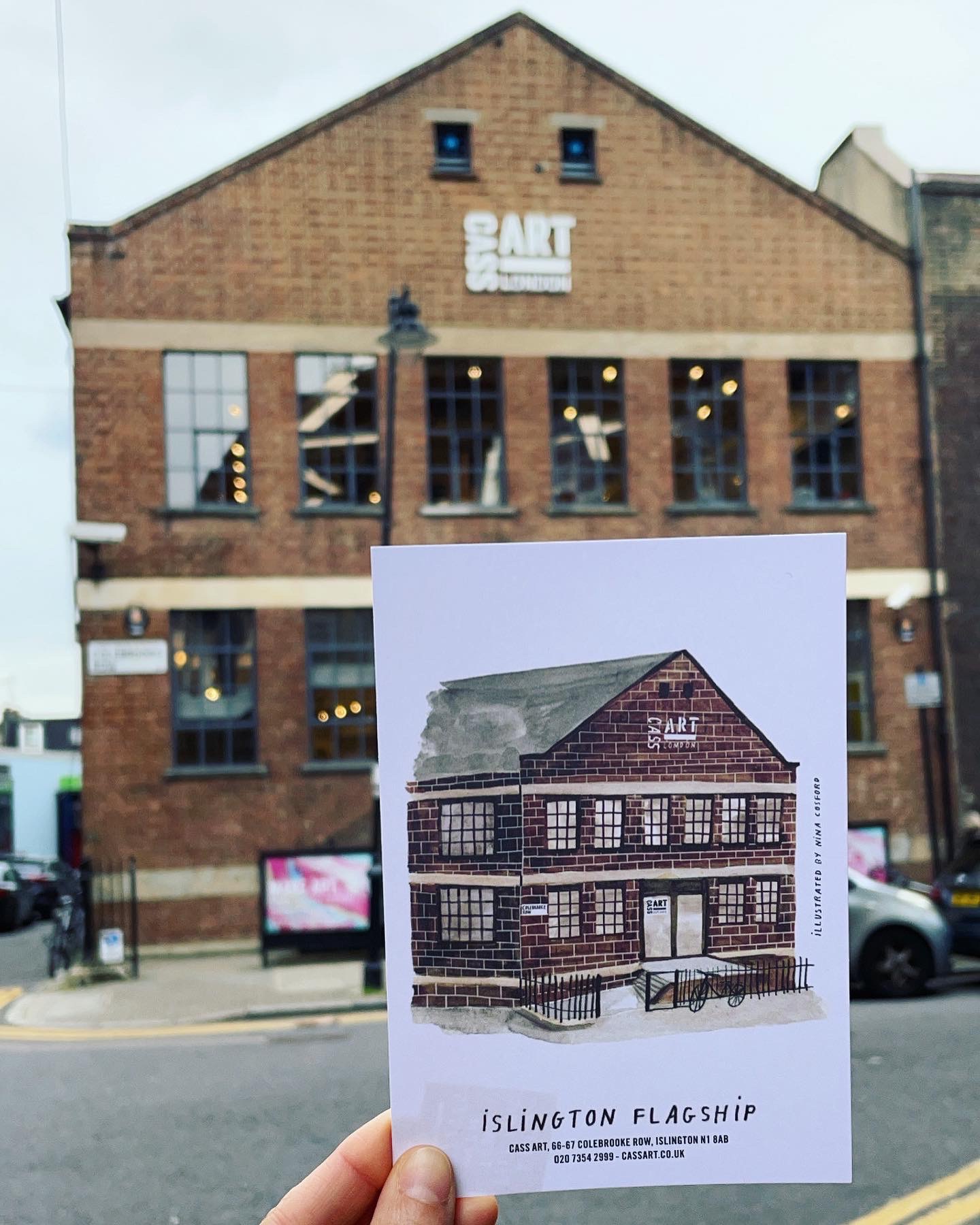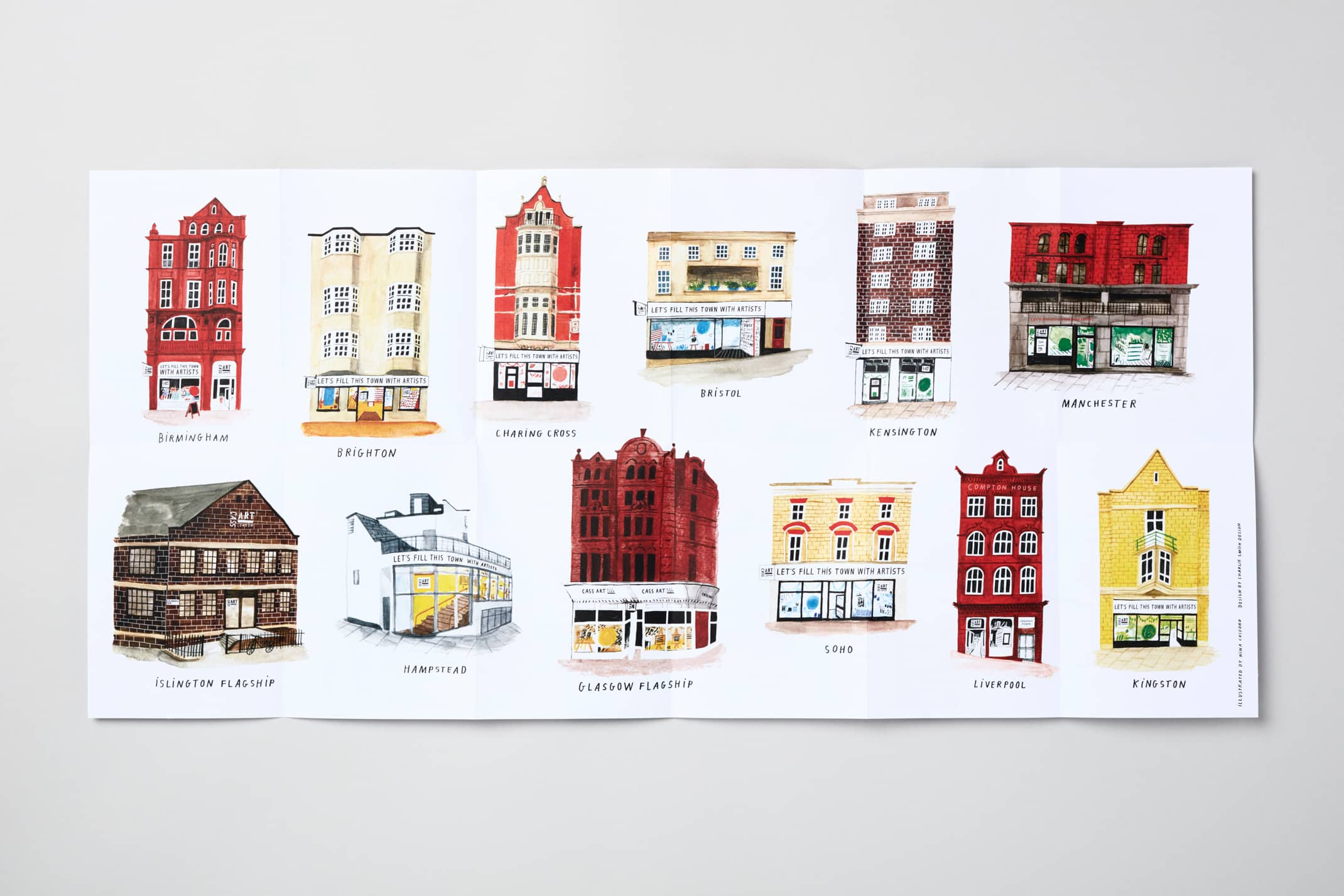 The timeline booklet opens up into a poster featuring all 12 Cass Art shop fronts and is widely available to pick up for free in-store. Nina’s illustrations and handwriting have also been used for promotional postcards and even on the staff’s uniforms!