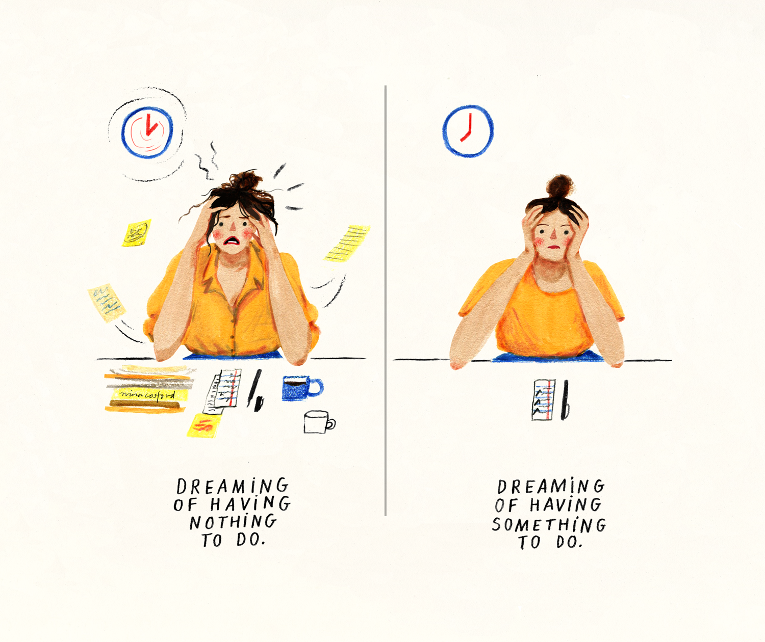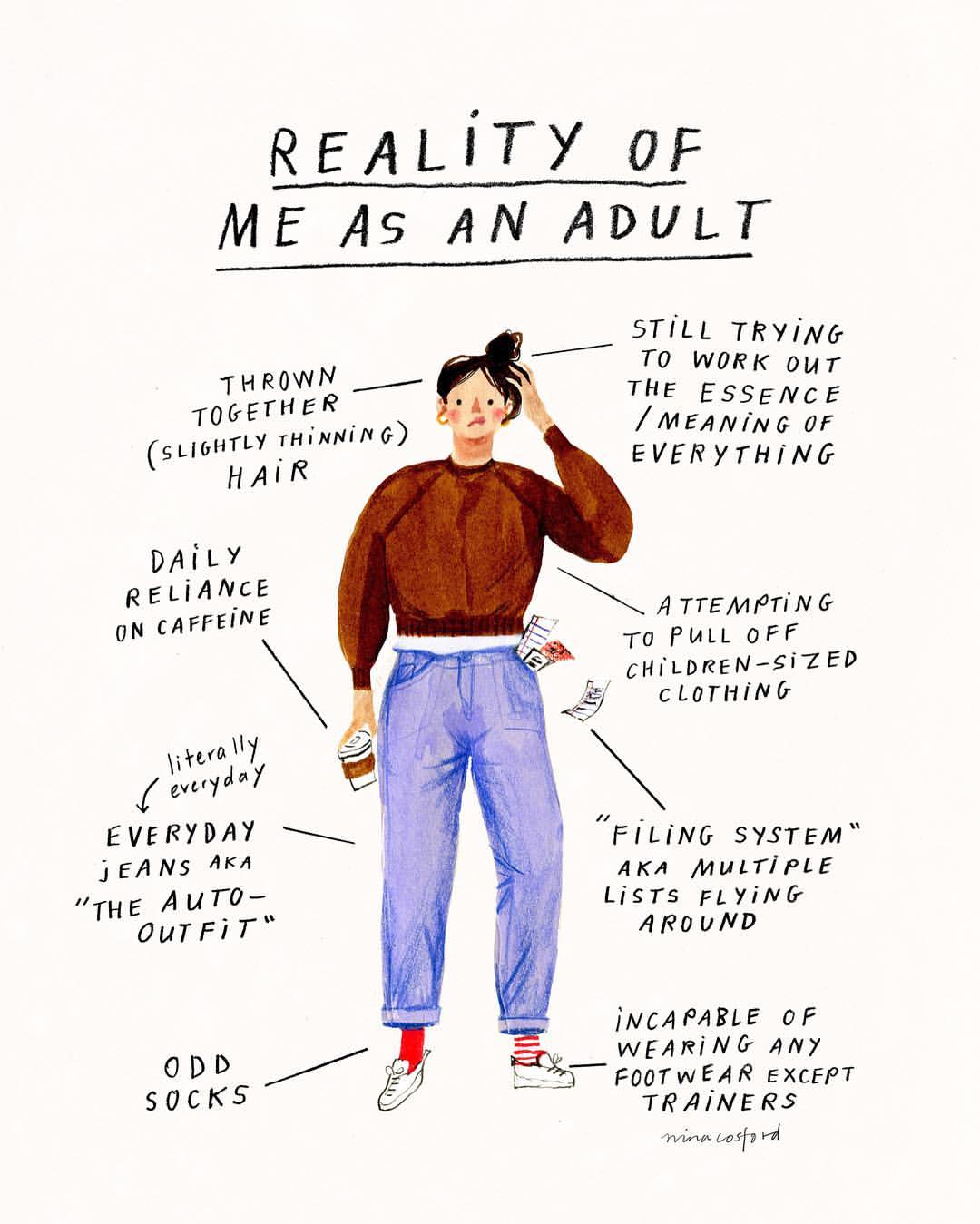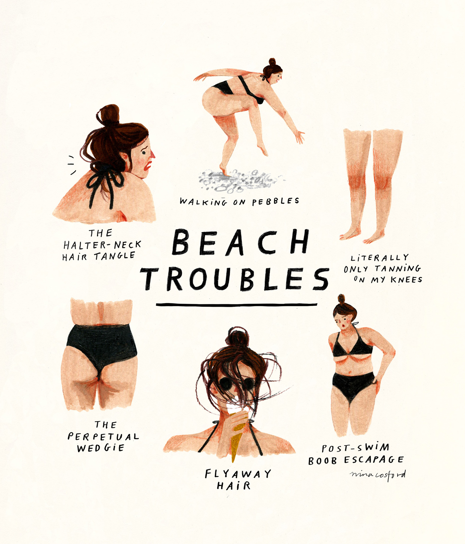 From the struggles of walking barefoot across a beach with dignity to having a painfully overactive brain, these self-initiated drawings explore various life scenarios one can come across.
