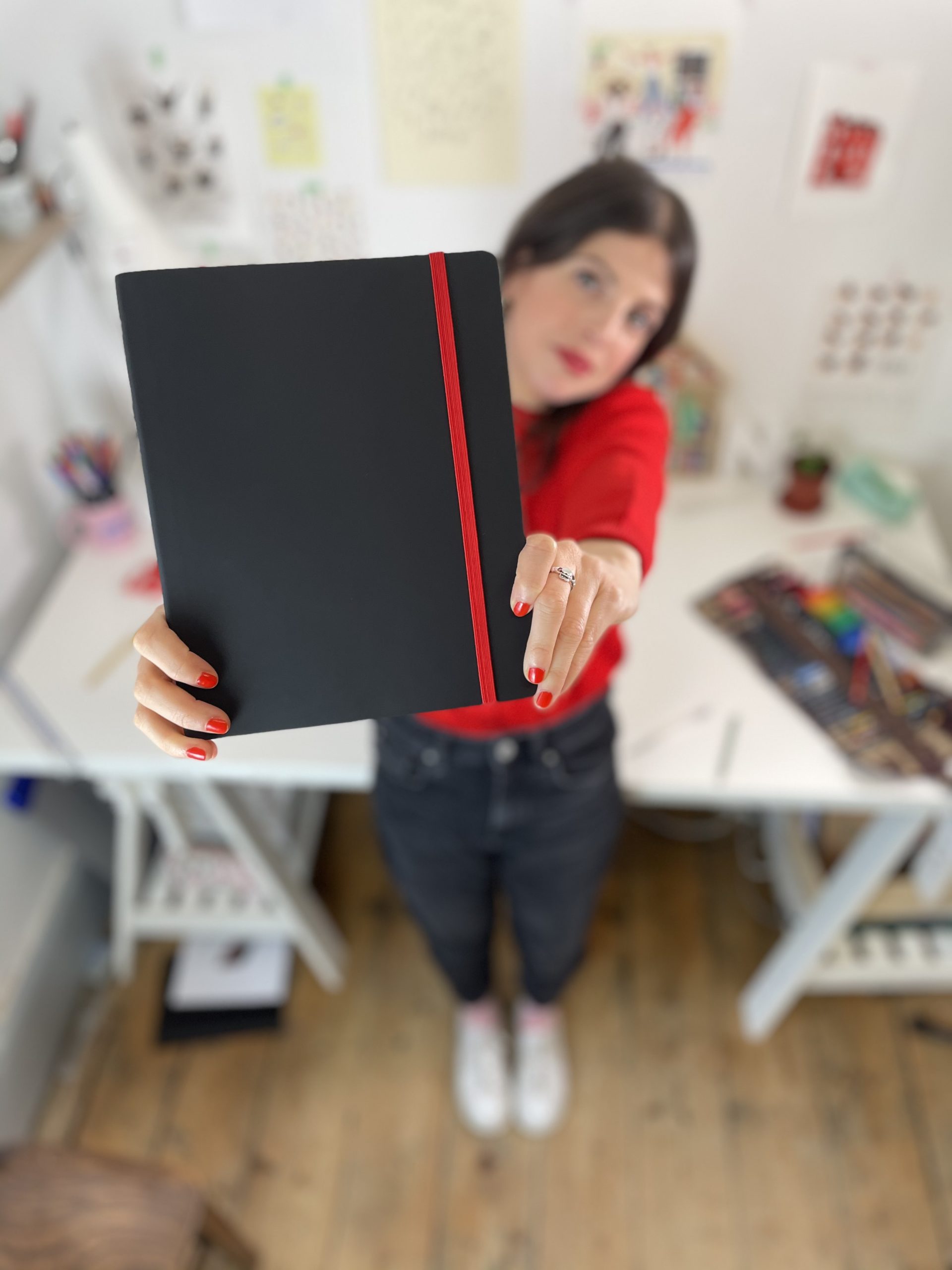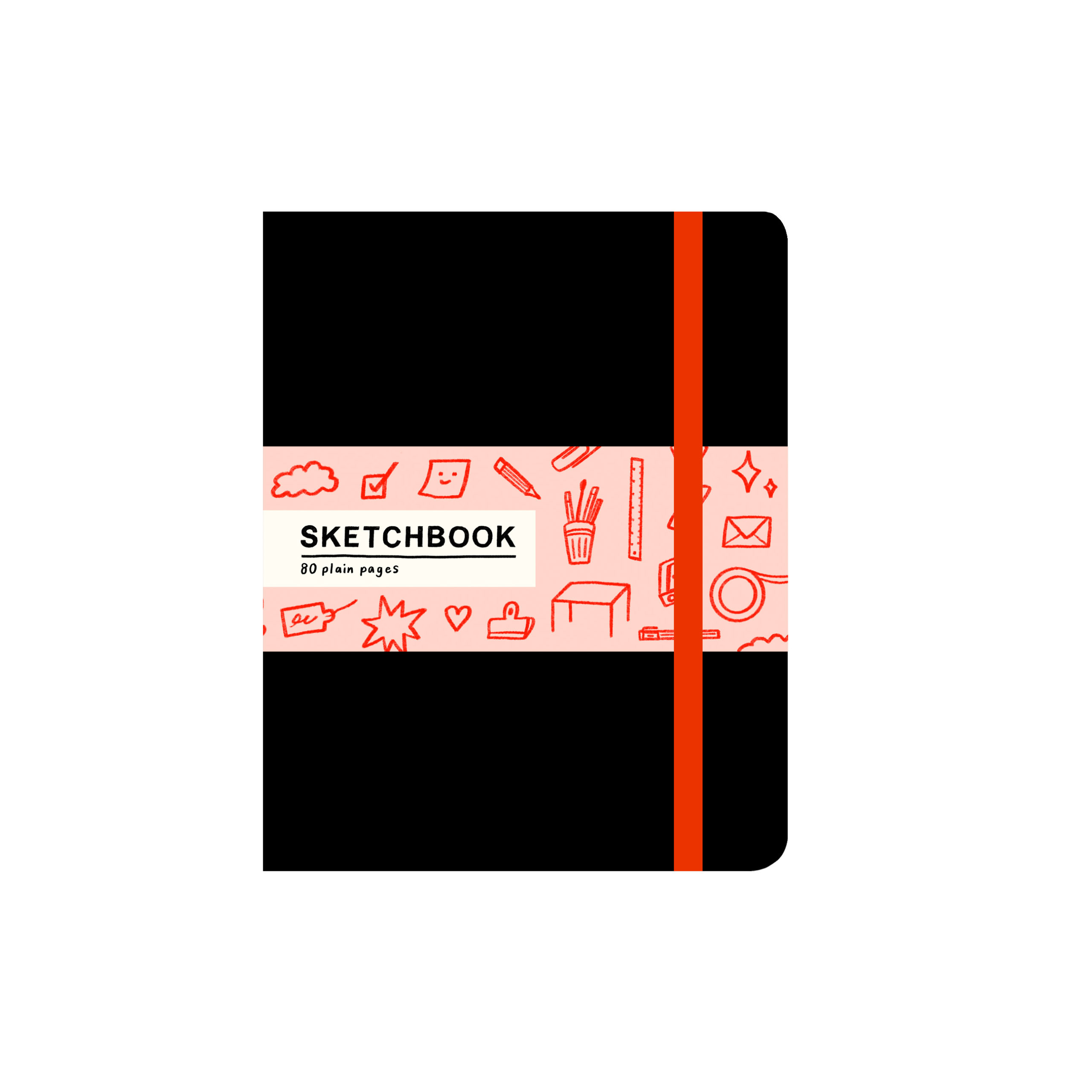 Each sketchbook contains 80 pages of beautifully smooth, plain off-white paper which is acid-free and sustainably-sourced. Stitch-binding allows the pages to open flat making it a pleasure to work in. All wrapped in a softback vegan PU leather cover which offers protection as well as flexibility. It’s complete with rounded corners, a ribbon bookmark, a handy expandable back pocket and a bright red band of elastic to keep it all tidy when closed.
