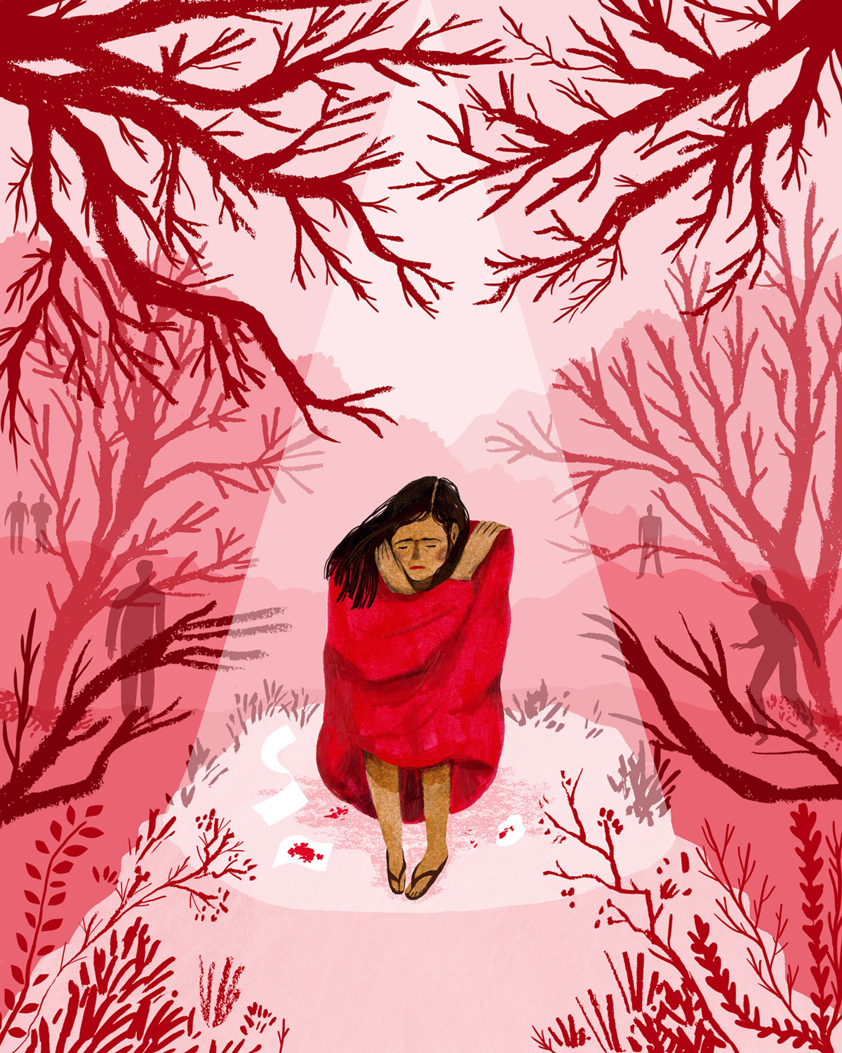 Nina’s three pieces which hung in her “cubicle” each explored the various challenges women can face when on their period – from comical moodswings to excruciating cramps to the serious threat to safety many women in developing countries have to face everyday.